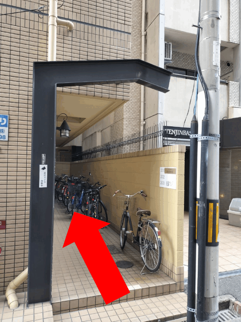 | 9)住宅入口には「天六整体真 」と表札があります。奥手を入るとエレベータがありますので2階へお上がりください。 |
